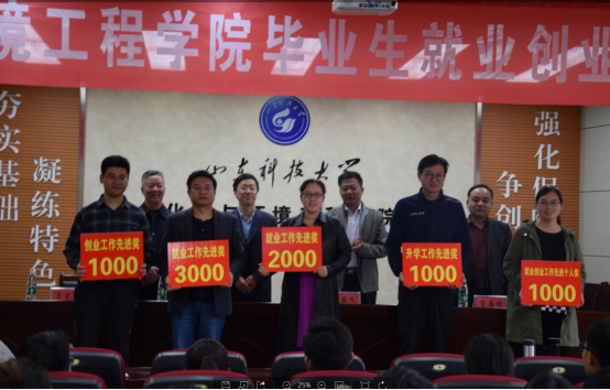 王斌宣读了《关于表彰2017年毕业生就业创业工作先进单位和先进个人的决定》,环境科学与工程系、化学工程与工艺系荣获“毕业生就业创业工作先进奖”,矿物加工工程系荣获“创业工作先进奖”,生物工程系荣获“毕业生升学工作先进奖”,郭婷婷荣获“毕业生就业创业工作先进个人奖”。随后,与会领导为先进集体和先进个人颁奖。