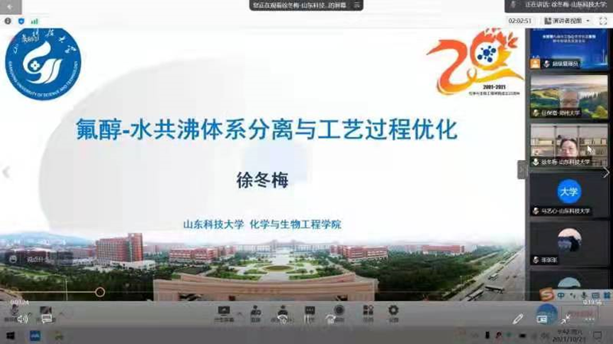 徐冬梅教授应邀做了题为《氟醇-水共沸体系分离与工艺过程优化》的大会报告,与参会的500多位专家学者分享了基于离子液体为萃取溶剂在氟醇-水共沸体系分离领域所做出的前瞻性研究和相关成果,取得了良好的交流效果。