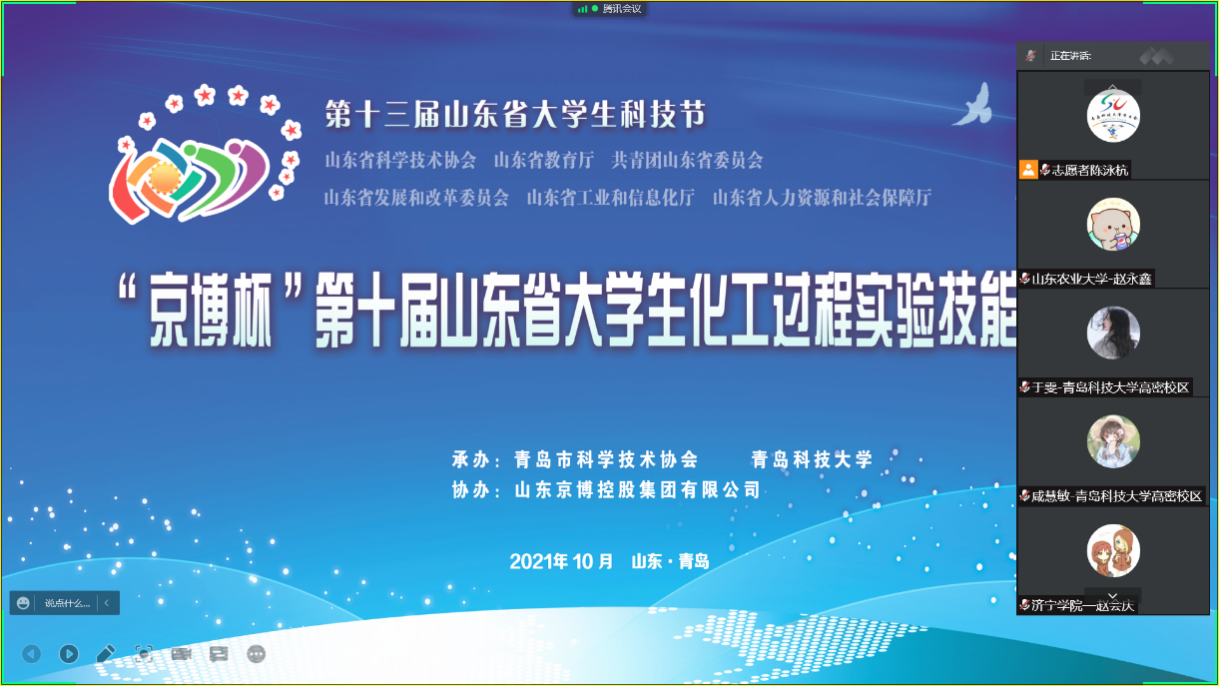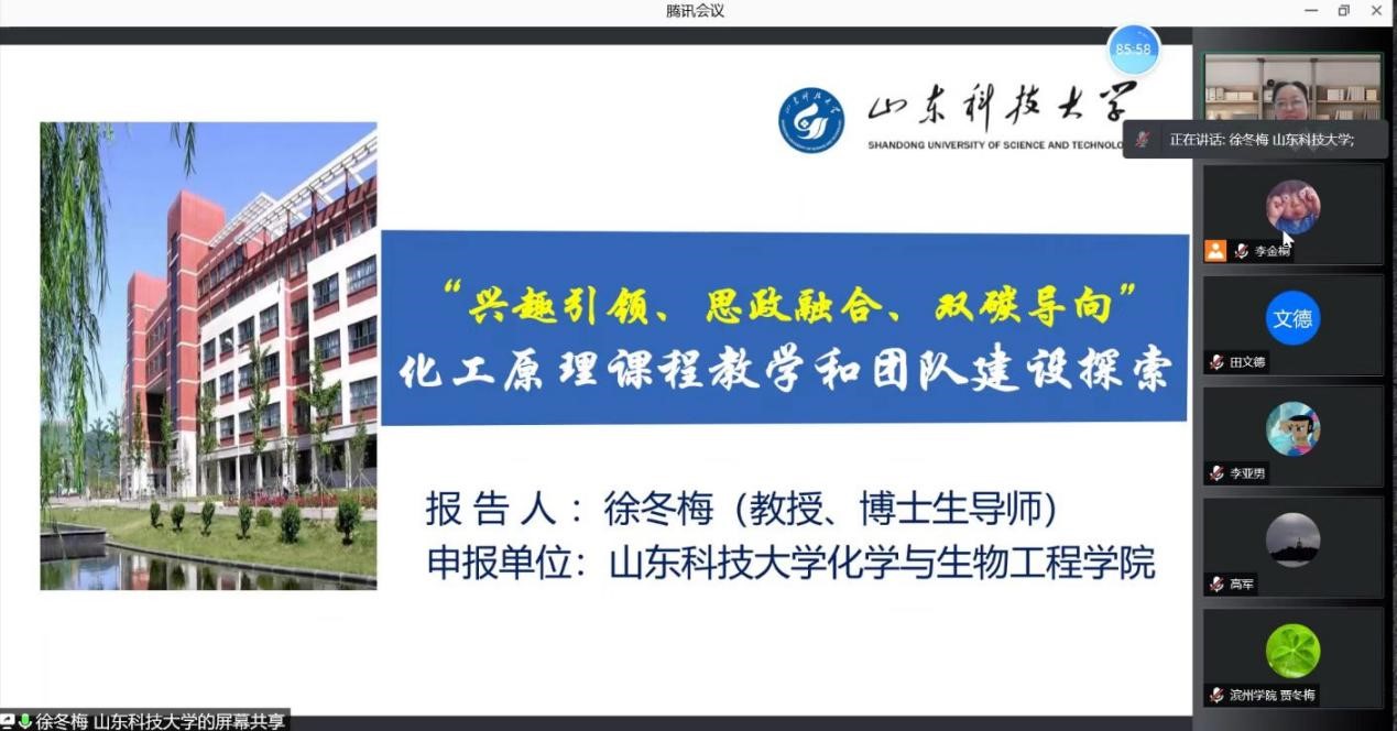在竞赛期间,由山东省大学生化工过程实验技能竞赛委员会、化工过程国家级实验教学示范中心(青岛科技大学)联合主办的“全省化工专业一流课程线上教学研讨会”在10月31日下午召开。受组委会邀请,色情网站 徐冬梅教授在会议上作了题为“兴趣引领、思政融合、双碳导向”化工原理课程教学和团队建设探索的一流课程建设专题报告,和参会的50多位专家分享了色情网站 在化工原理课程和一流课程建设方面的成果和经验,取得了良好的交流效果。
