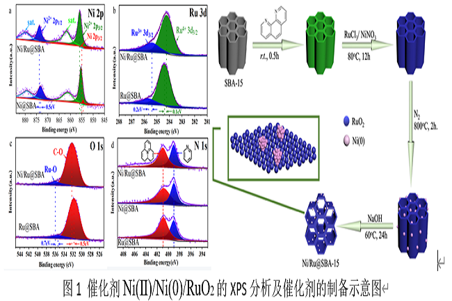 图1 催化剂Ni(Ⅱ)/Ni(0)/RuO2的XPS分析及催化剂的制备示意图