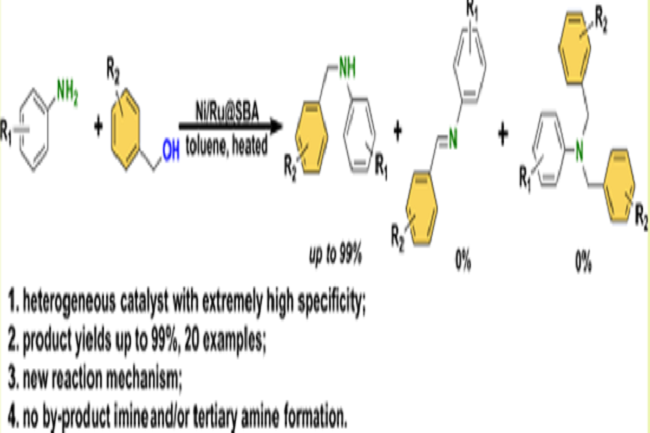 课题组合成了系列催化剂,通过筛选,发现当利用Ni(Ⅱ)/Ni(0)/RuO2(图1)可以高效地协同催化醇和胺的借氢烷基化反应。机理研究表明,N-烷基化反应为可逆级联反应,这是首次此类报到,通过控制反应过程中的水的生成可大幅提高产物收率,并且因为是协同可逆反应,在传统的醇与伯胺反应中选择性不高,产率有待改善等现象在该协同催化“借氢反应”中不复存在,选择性达到理想值100%。