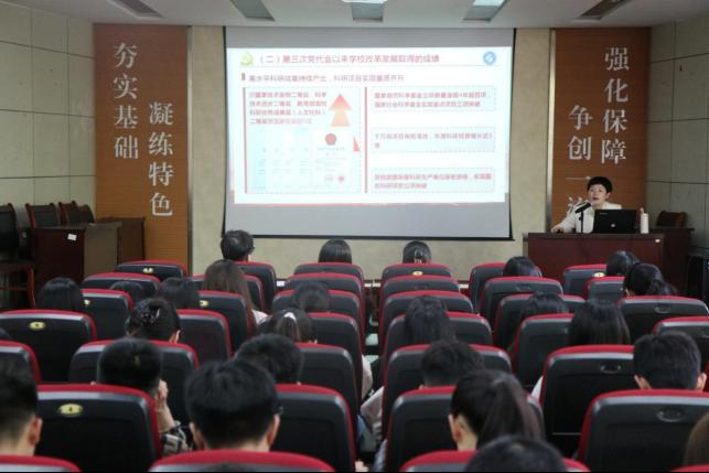 田书记带领大家回顾了学校第三次党代会以来学校改革发展取得的成绩,从学校第四次党代会基本情况、会议的重要意义和主要成果、会议主要精神以及确保第四次党代会精神落实见效等四个方面对学校第四次党代会精神进行了深入解读。她系统阐述了学校第四次党代会确定的“一三六八十”的战略布局,即锚定“一个目标”,坚持“三步走”,实施“六大战略”,迭代“八项任务”,升级“十大工程”。