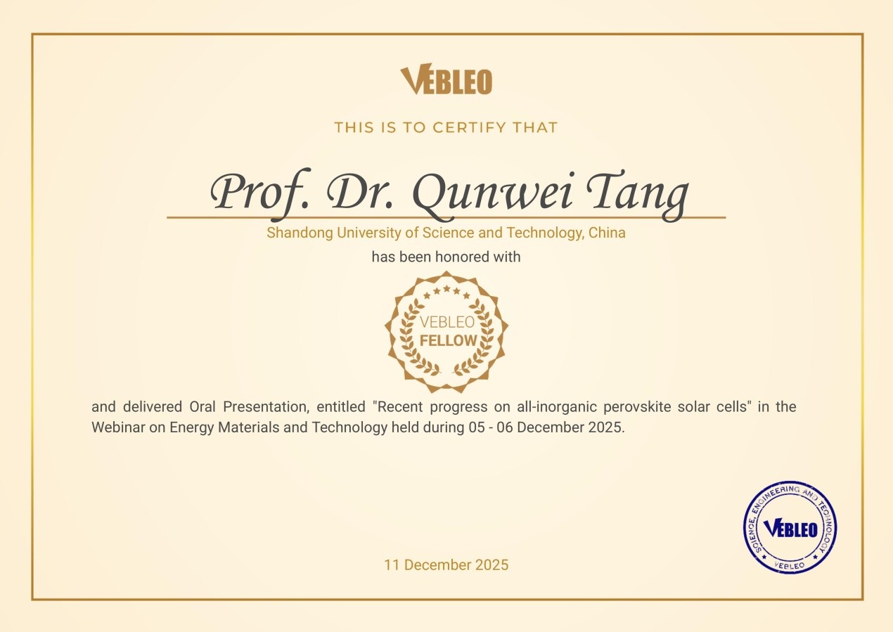 唐群委教授被授予国际科学组织Vebleo协会会士(Vebleo Fellow),并于12月5日受邀在Vebleo协会主办的能源材料与技术国际会议上作了题为“Recent progress on all - inorganic perovskite solar cells”的特邀报告。
