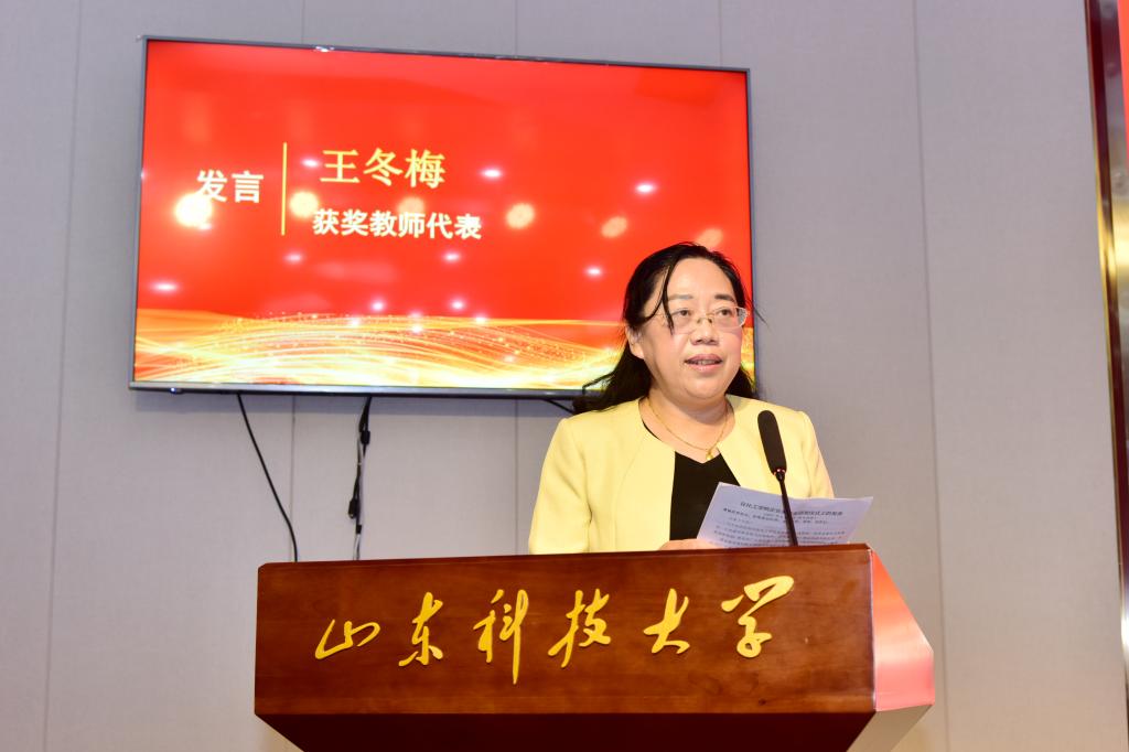 获奖教师代表王冬梅发言,她表示今后将继续紧盯课程核心任务,在培养学生高阶性、创新性和挑战度上下功夫。获奖学生代表丁倩表示,将勇担责任和使命,以己之力发光发热,回报学校、回报社会。
