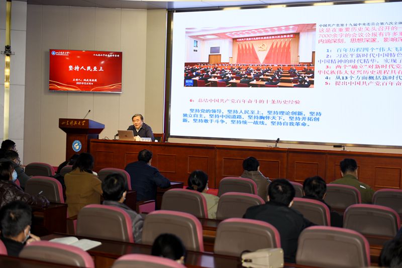 宣讲会上,姚庆国紧紧围绕学习贯彻习近平总书记在党的十九届六中全会上的重要讲话精神,引用文献史料并穿插党史上的鲜活事例,对《决议》的思想内涵进行剖析和解读,表示人民性是《决议》的鲜明特质,要从马克思主义产生和马克思主义中国化的角度来认识领悟、从中华民族的发展历史发展的角度来认识领悟、从建党100年历史发展的角度来认识领悟。