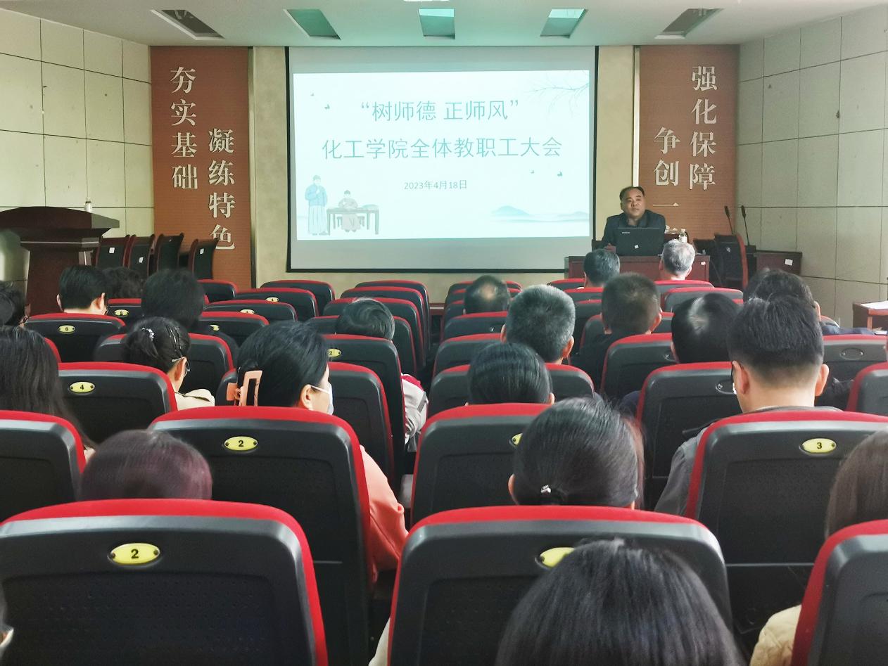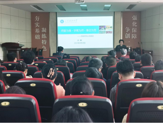 邵谦教授作《师爱为魂·学高为师·身正为范》主题报告,学院全体教职工参加,会议由学院党委书记窦存增主持。
