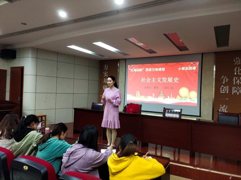 “小葵花”系列团课第二讲开讲。本次课程仍由团委书记易凡担任主讲,各班级团支部书记参加了培训。此次团课的主要内容是社会主义发展史。首先,易凡老师用半个小时的时间,详细介绍了社会主义产生的根源以及发展的各个阶段。随后,沿着社会主义发展脉络,她带领各团支部书记回顾了中国特色社会主义理论发展的历史轨迹,并强调了广大团支部书记更应该在新时代的背景下,深入了解中国特色社会主义的发展历史和深刻内涵,做好社会主义史的理论传播者,在广大团员中间发挥思想引领的模范带头作用,以成长为中国特色社会主义事业合格的建设者和可靠的接班人。