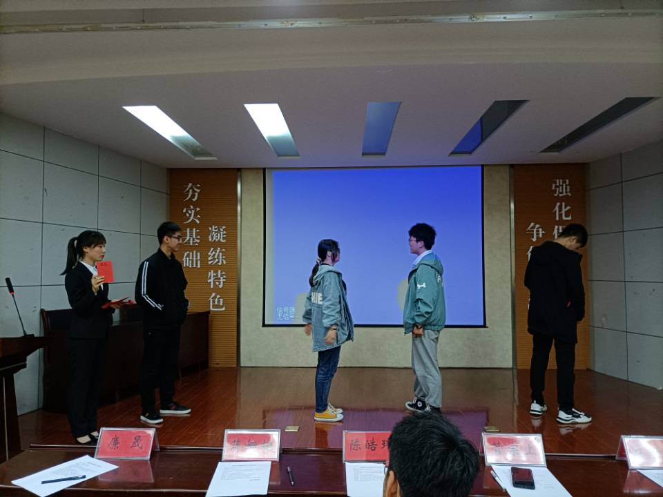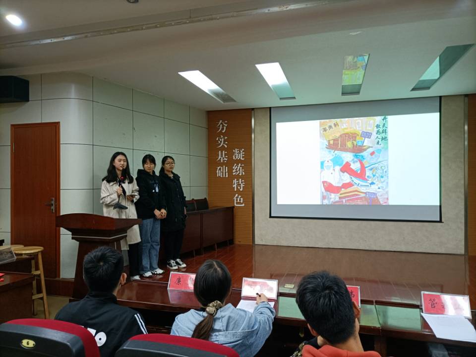 选手们用海报展现才华,用声音传递能量,经过选拔,共有10件优秀作品进入到决赛。决赛现场,屏幕闪烁,选手们结合精心制作的PPT依次进行生动演说,阐述作品寓意、诠释创作灵感,用最生动的语调、最饱满的热情赢得全场阵阵掌声,评委们聚精会神、仔细聆听,认真客观地对选手进行打分。在等待最后成绩出炉的紧张时刻,互动游戏“你画我猜”使现场氛围轻松起来,各组参赛人员积极参与,充分发挥了想象力,增进了同学间的默契,加强了交流。