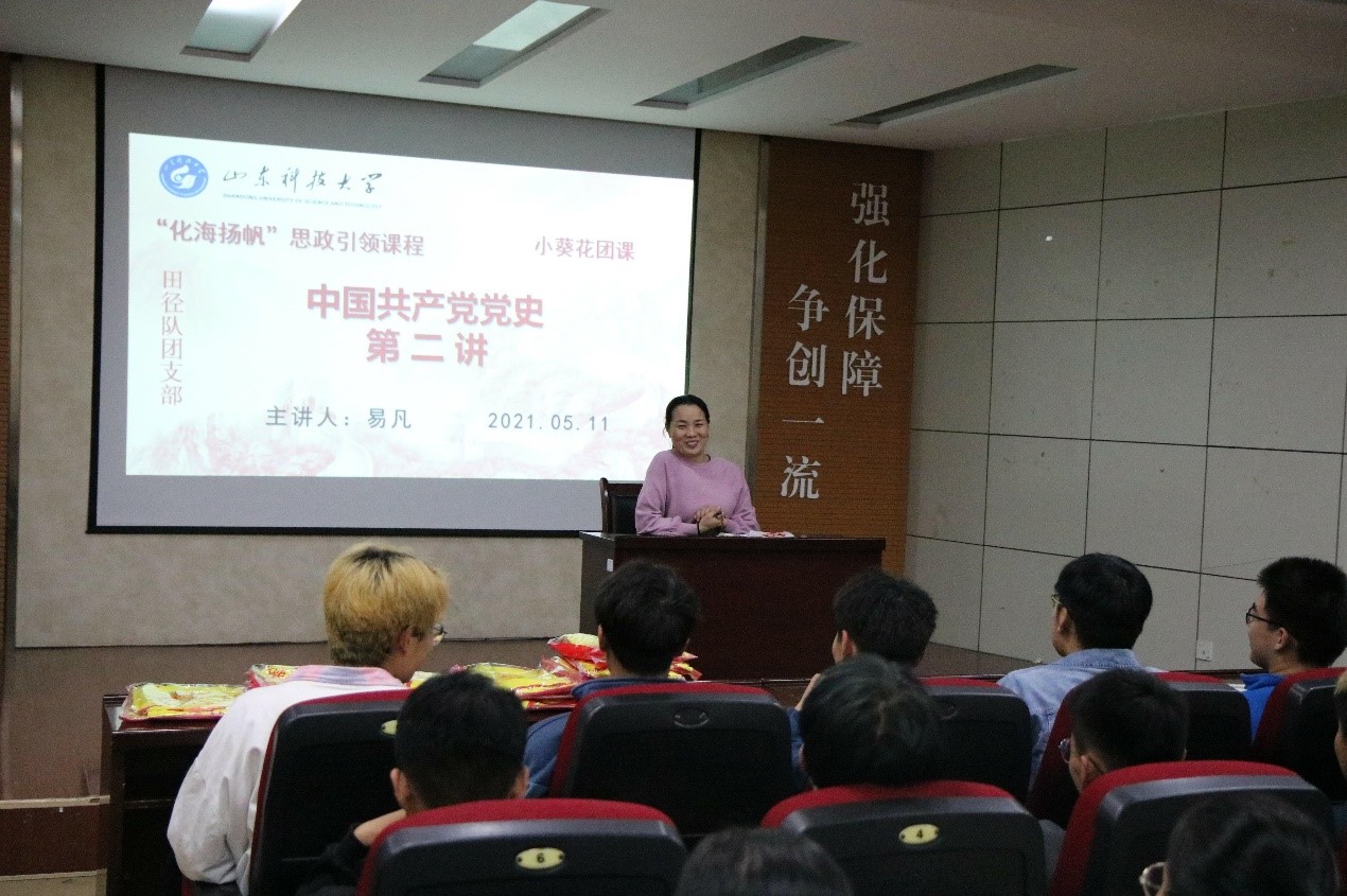 田径队队员到场聆听。本次团课的主要内容是党史学习教育第二讲--中国共产党百年光辉历程及宝贵经验。在课堂上,易凡老师系统讲述了在中国共产党领导下,从中共一大到国共革命,从南昌起义到抗日战争,从解放战争到新中国成立,从抗美援朝到文化大革命,从改革开放到党的十八大直至现在的社会主义新时代,中华民族从站起来、富起来到强起来的伟大飞跃以及中国共产党百年奋斗的光辉历程和历史性贡献,阐释了学史明理、学史增信、学史崇德、学史力行和学党史、悟思想、办实事、开新局的党史“必修课”要求。课程结束时,易凡老师鼓励田径队成员切实将党史学习教育成效转化为工作实效,以优异成绩迎接建党100周年和建校70周年。