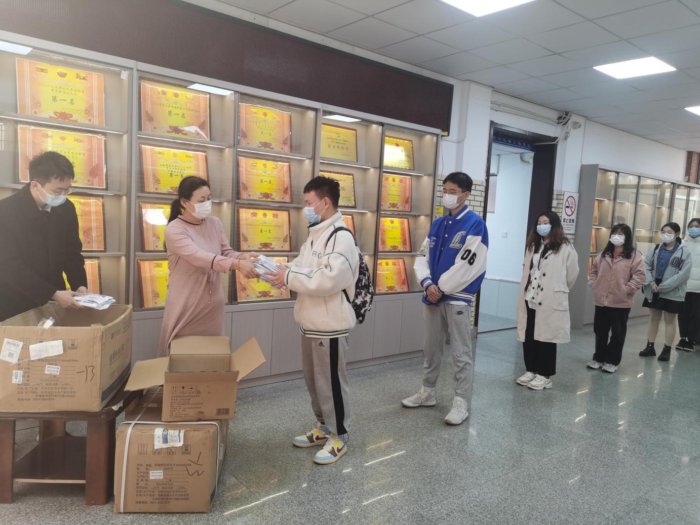 口罩作为防疫重要物资,可以有效防止病毒传染,出行佩戴口罩成为全民共克疫情的关键一招。此次发放口罩,不仅帮助师生缓解了对口罩的需求,还向师生传递出学院对待疫情防控的坚定态度,并引导他们进一步认识到佩戴口罩的必要性和重要性。为减少人员聚集现象,学院组织各系(中心)教工代表、各年级学生代表领取口罩,并及时分发给全体师生。