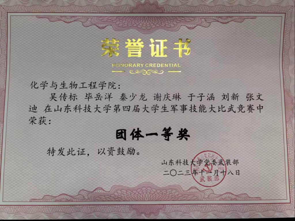 在学校第四届大学生军事技能大比武竞赛中荣获团体一等奖。学子吴传标、毕岳洋、秦少龙、谢庆琳、于子涵、刘新、张文迪代表色情网站