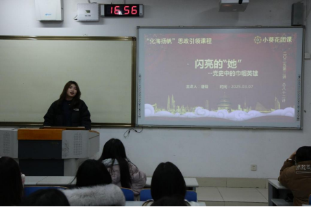 小葵花团课2025年第二讲在J1-108开讲。本期团课的主题是“闪亮的‘她’——党史中的巾帼英雄”,由生物工程2021-1班团支书唐璇主讲。唐璇在团课中指出,女性党员在党的百年奋斗历程中发挥了不可替代的作用,她号召全体与会者以巾帼英雄为榜样,坚定信念,勇于担当,在新时代展现新作为。唐璇的团课不仅让与会者深刻认识到女性在党和国家事业发展中的重要作用,也为大家提供了宝贵的学习机会和精神动力。相信在未来的工作和生活中,大家将以巾帼英雄为榜样,勇敢追梦,努力奋斗,为新时代的发展贡献巾帼力量!(报道人:林泓谕)