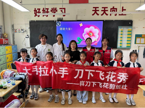 学生的指导下,孩子们动手进行剪纸创作。起初,孩子们操作剪刀并不熟练,不一会儿,一个个略显稚嫩却充满童趣的“福”字、窗花便初具雏形。活动在欢快的氛围中结束,活动不仅让学生们体验了传统手工艺的制作过程,更深刻感受到中华传统文化的艺术价值。此次活动不仅让小学生们感受到了非遗剪纸文化的魅力,而且增强了他们的文化自信。临别时,孩子们纷纷表示,期待再次参与类似的传统文化体验。活动在亲密的互动合影中宣告结束。