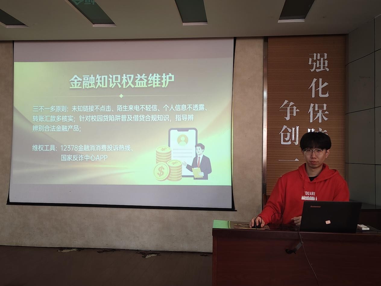 在J2-104报告厅举办“金融知识进校园”主题宣讲活动。由优选计划辅导员李子龙主讲,旨在提升学生金融风险防范能力。