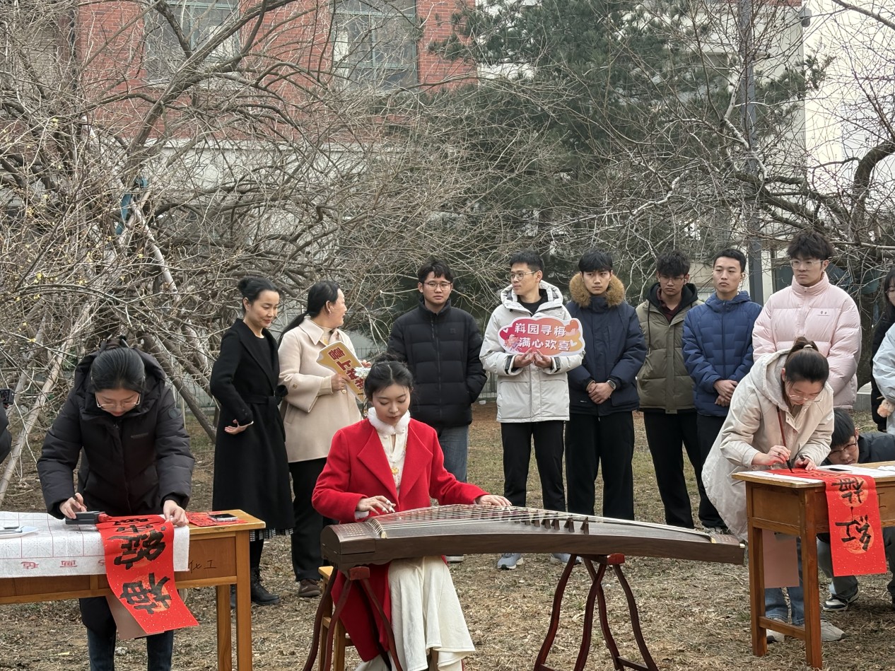 团委书记兼学工办主任易凡主持,以“梅绽嵙园凝浩气 莘莘学子守初心”为主题,特邀院心理健康负责老师李玲玲及院研究生党支部、心理健康联合会部分学生代表参与课程。在暗香浮动的园中,以梅为媒,效古人雅集之风,疏影横斜,畅叙幽情,师生携手上了一堂融合自然美育、诗词文化、红色传承与心理育人的沉浸式思政课。