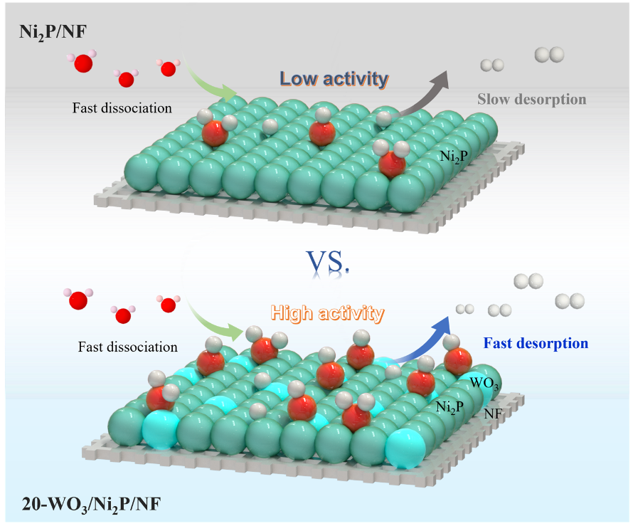 氢能作为一种来源广泛、零碳排放、灵活高效的二次能源,是推动全球能源结构向清洁化、低碳化转型,构建全球低碳能源体系的重要一环。高电流密度下氢气的规模化生产对于电解水工业的推广与应用具有重要意义。迄今为止,Pt基催化剂仍旧被认为是碱性氢析出反应(HER)催化剂的标杆,但高的制备成本和资源稀缺性严重限制了其广泛应用。过渡金属磷化镍(Ni2P)由于出色的水解离性能而在碱性水电解制氢领域中备受关注,然而与贵金属Pt相比,氢吸附位点的缺乏使其难以快速消耗Volmer步骤所产生的氢质子,导致了较差的HER性能。因此,如何优化氢质子在磷化镍材料表面的吸附效果非常关键但仍具有挑战性。
