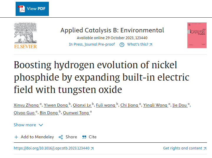 张鑫宇(学术教授)、唐群委(教授)等人在电催化水分解制氢领域取得最新进展,相关成果以“Boosting hydrogen evolution of nickel phosphide by expanding built-in electric field with tungsten oxide”为题发表在权威期刊Applied Catalysis B: Environmental上(中科院Top一区,影响因子:22.1)。