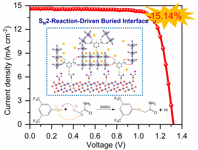 钙钛矿太阳能电池因具有光电转换效率高和制备工艺简单等优势已成为太阳能光伏领域的前沿技术,但没有定制化学键的弱埋底界面相互作用不利于形成高质量的钙钛矿薄膜,而钙钛矿薄膜的质量在很大程度上决定了钙钛矿太阳能电池的效率和稳定性。为了解决这个问题,我们在提出了一种双分子亲核取代反应(SN2)驱动策略,分别用碘乙酰胺和硫醇分子修饰底层底物和作用[PbX6]4-八面体框架来加强埋底界面处的相互连接。理论和实验结果表明,两个分子中暴露的卤素和巯基基团之间发生了强烈的SN2反应,这不仅有利于加强埋藏的粘附性,还能引发靶点定向结晶,协同提升上部钙钛矿薄膜的质量,加速界面电荷提取-转移行为。得益于非辐射复合的抑制,空气处理的碳基全无机CsPbI2Br器件的效率提高了15.14%,更重要的是,它在光照、高温等恶劣的环境下的运行稳定性显著延长。这种独特的反应驱动埋底界面为调控钙钛矿生长和获得高效钙钛矿太阳能电池提供了一条新途径。