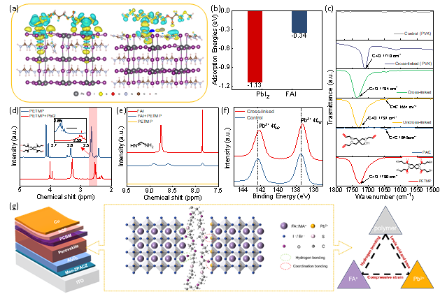 本工作中,开发了一种光诱导原位聚合调节策略,采用PAE和PETMP作为交联剂,聚合单体经紫外光诱导原位聚合在钙钛矿体相中形成三维交联网络。聚合物与PbI₂终端面结合能以及FA⁺的氢键作用能,均强于钙钛矿自身骨架相互作用,使得聚合物与钙钛矿可以实现双锚定作用。此外,光诱导聚合过程与钙钛矿结晶过程同步进行,聚合物梯度分布与薄膜残余应变分布高度匹配,能有效释放薄膜残余应力抑制离子迁移。该策略的聚合物网络在收缩过程中对晶格施加水平压缩与垂直拉伸力,有效地释放了残余应变,实现了原子尺度到宏观力学性能的协同优化。通过原子级交联释放残余应力策略,钙钛矿太阳能电池最佳器件效率达25.56%,且滞后效应显著降低。未封装器件在85℃氮气环境中连续运行1000小时后仍保持90%的初始效率,远超对照组62%。