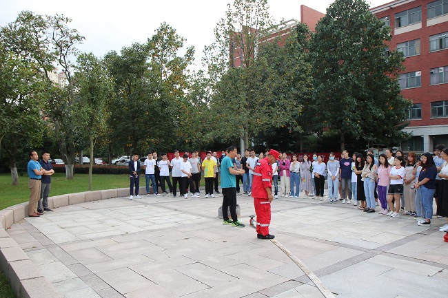 此次培训邀请到安全管理处李灿军、陈浩老师为师生进行讲演。两位老师详细讲解了消防栓开启、水带连接、灭火器使用方法等知识,并现场做了示范。随后,现场模拟了火情发生的场景,师生两人一组,根据风向确定最佳灭火位置,拿起干粉灭火器,上下颠倒几次后拔掉保险销,左手握住喷管,右手提着压把,在距离火焰两米处对准火焰根部进行灭火。大家操作规范,培训效果良好。